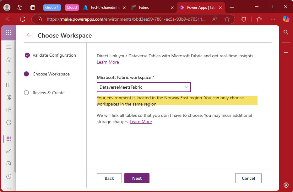 Your environment is located in the <name of region> region. You can only choose workspaces in the same region. We will link all tables so that you don’t have to choose. [...]