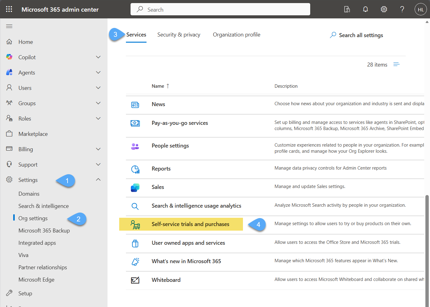 - Go to Settings → Org Settings → Services → Self-service trials and purchases