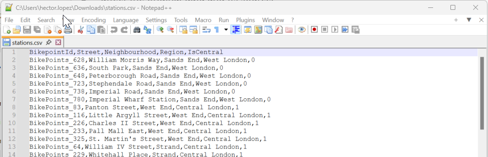 It is simple CSV file that contain the relation between bike stations and the regions they belong to! This will help us to summarize the data by Region, we are also including another important information, that is, whether the bike station is in Central London or not, again, this information would allow us to extend our analysis over the stream data.