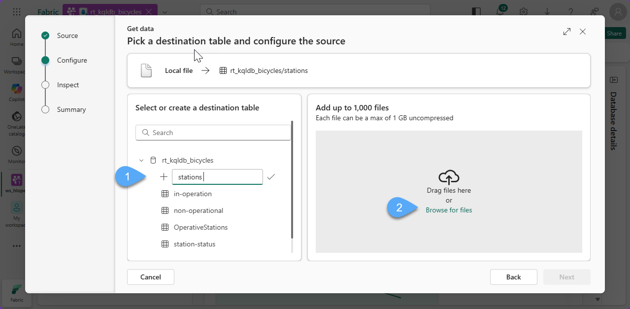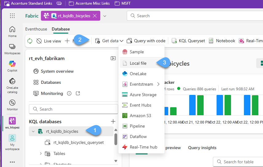 #2. In the rt_kqldb_bicycles KQL database 1️⃣, click + Get Data 2️⃣ and select Local file 3️⃣