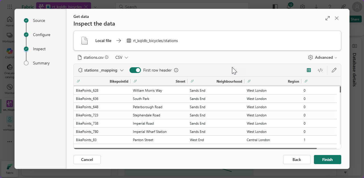 #5. Make sure the toggle button Fist row header is On and click Finish