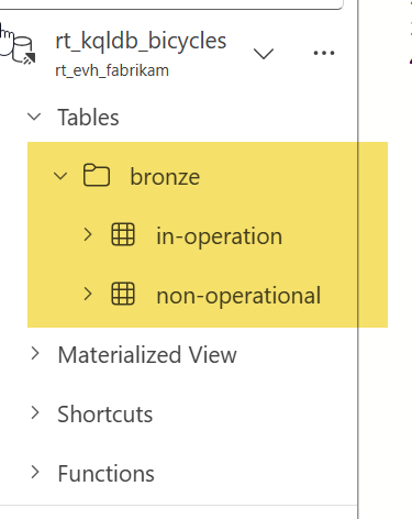 - You created dimension tables and shortcuts in your KQL database to enrich your stream with external data and organized your environment by placing tables into folders that correspond to each layer of the architecture for clarity and structure.