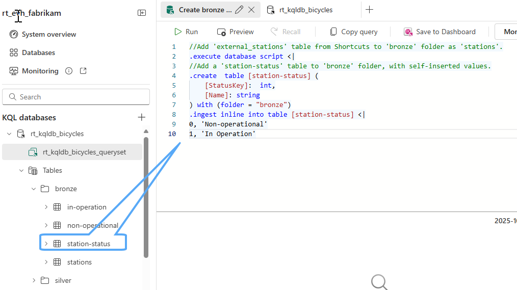In this example, you're enriching your streaming dataset by manually creating a small reference table called station-status within the "bronze" folder of your KQL database. This table contains inline data representing operational statuses for stations, with each status assigned a key and a descriptive name. You're using the .create table command to define the schema, followed by .ingest inline to insert the values directly.