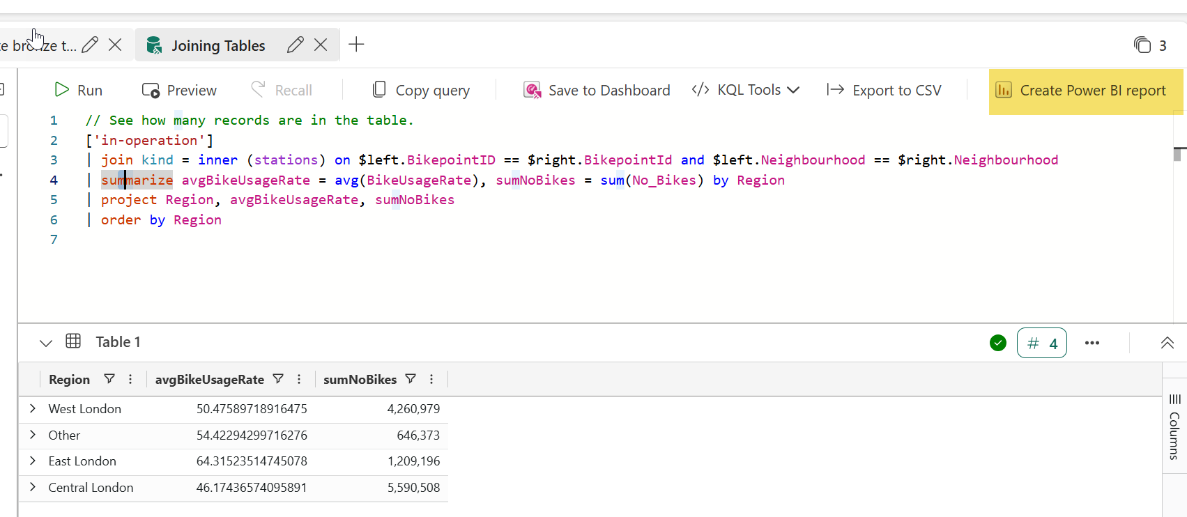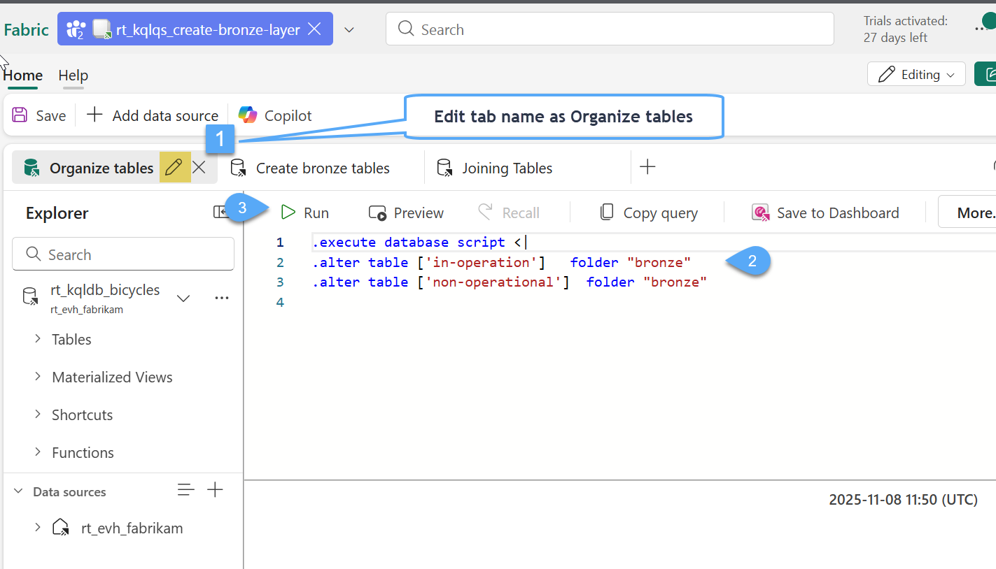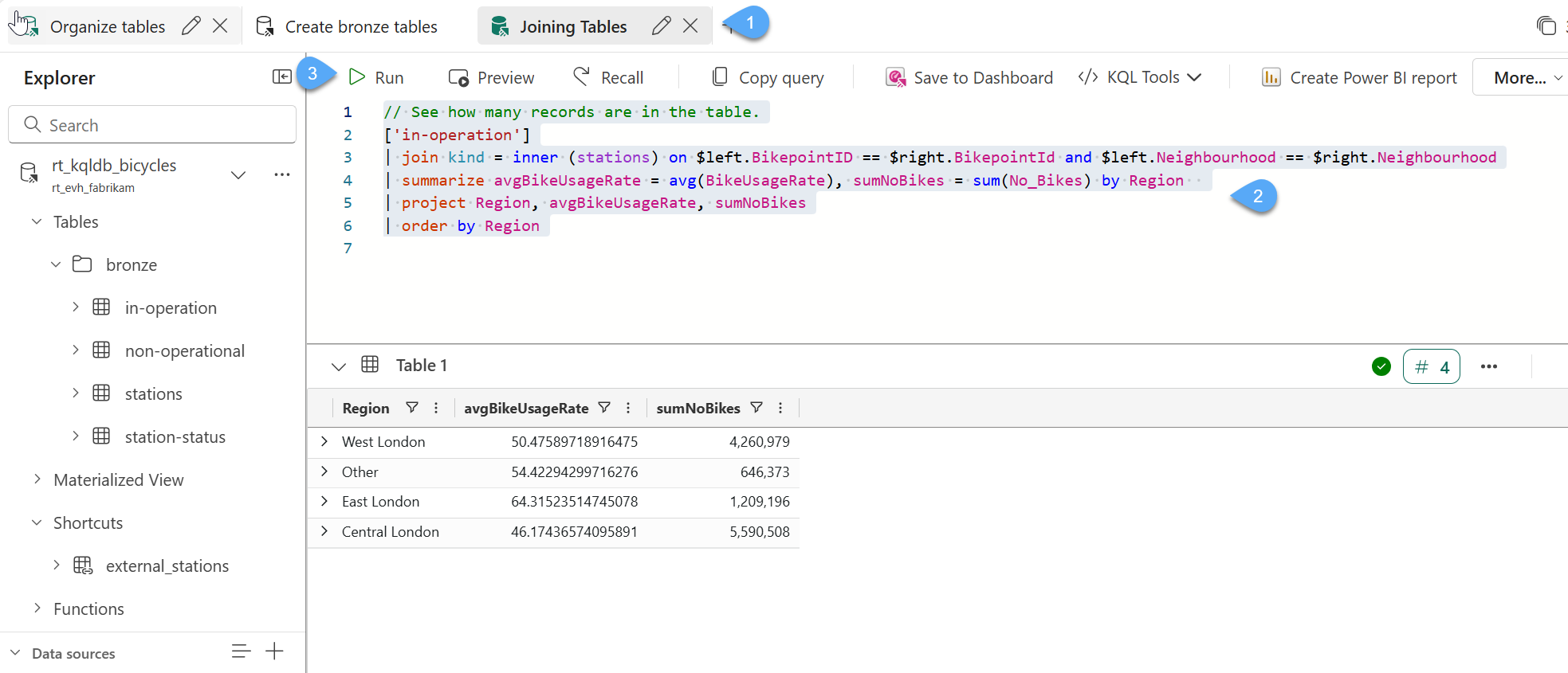 #1. Within the queryset rt_kqlqs_create-bronze-layer, create a new tab and rename the new tab as Joining tables 1️⃣, replace the sample code with the following script 2️⃣ and click Run 3️⃣