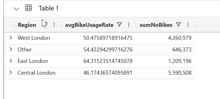 | project Region, avgBikeUsageRate, sumNoBikes