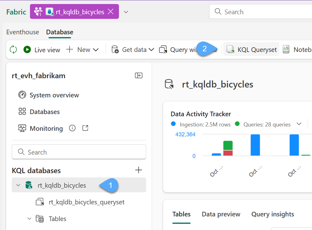 #1. Navigate to the KQL Database you have been using within your Fabric workspace 1️⃣, from the menu bar at the top select the KQL Queryset 2️⃣ option to create a new Queryset.