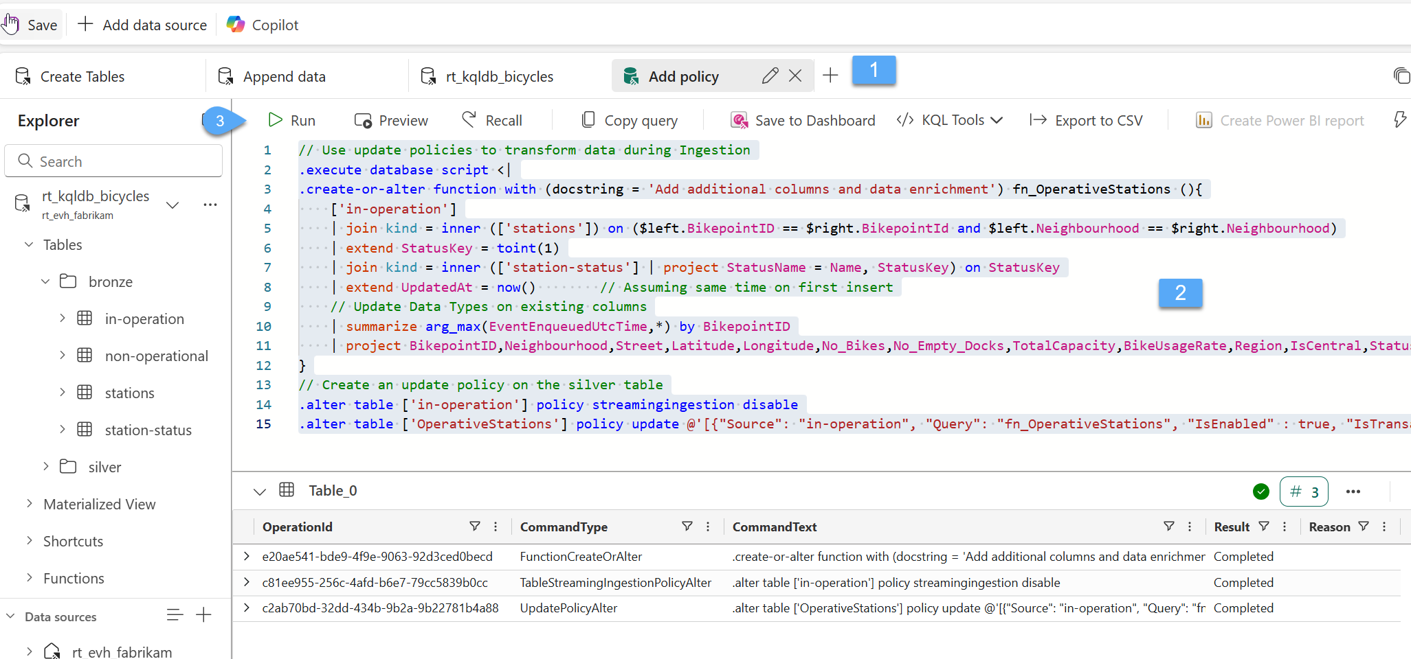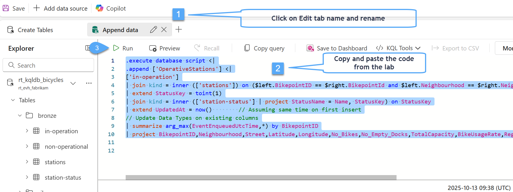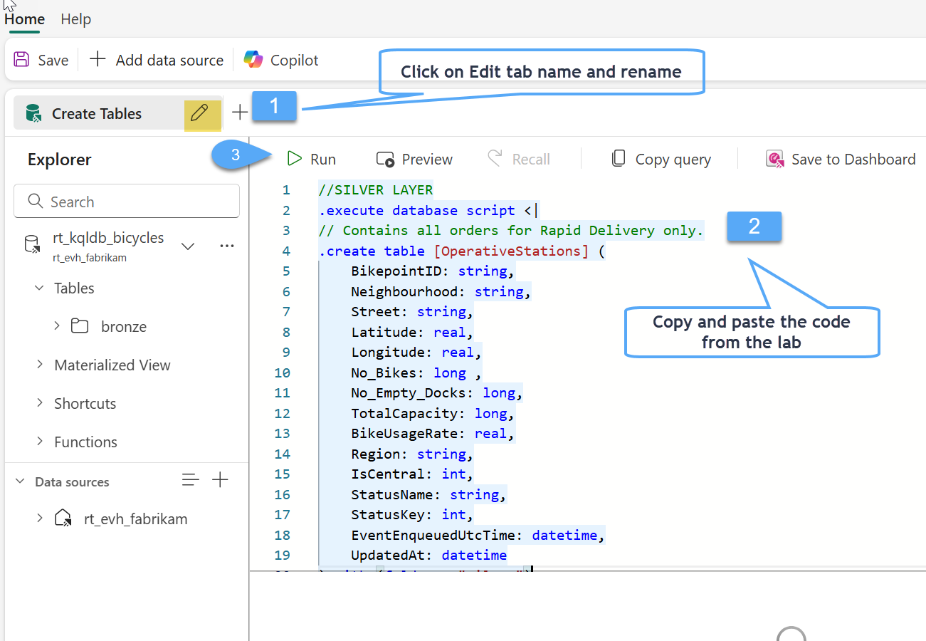 #3. Let's rename the default tab that we are working to Create Tables 1️⃣, copy the Code below and paste it into the Queryset window 2️⃣, select all the code and click Run! 3️⃣. The KQL will define the column names and data types for the table and stored it in the "silver" folder.
