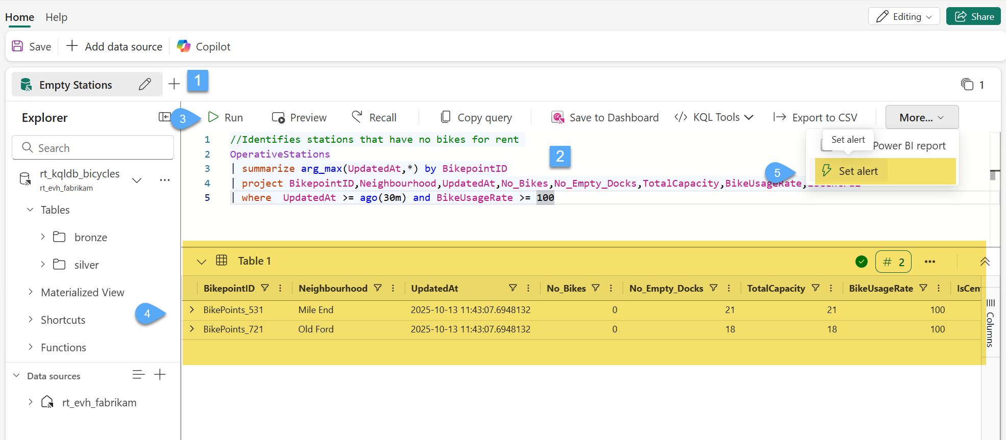 #3. Delete any existing KQL code that may exist in the default query tab and re-label the tab to Empty Stations 1️⃣, copy the code below and paste it into the tab 2️⃣, select all and Run 3️⃣, most likely you will see the query will return the stations with no bicycles for rent 4️⃣, click on Set alert 5️⃣