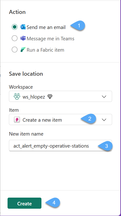 #4. Within the Set alert options we will choose to run the query every 5 minutes, leave the Condition to the default and only option, set the Action to Send me an email 1️⃣, and choose Create a new item and give the name act_alert_empty-operative-stations 2️⃣3️⃣ and Create 4️⃣