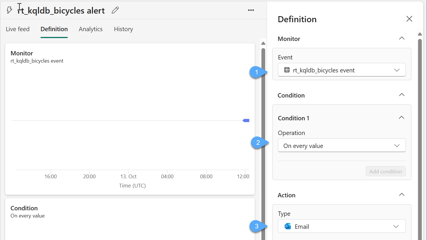 #7. There are various areas of interest when looking at a rule, but the one you will focus on is labeled Definition which allows you to configure what you are monitoring 1️⃣, what is the condition which will trigger the action 2️⃣, and what action will be taken when the condition is met 3️⃣.