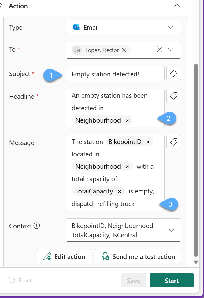 #8. Now you will configure the Subject with Empty station detected!1️⃣, Headline with An empty station has been detected in @Neighbourhood 2️⃣ and Message with The station @BikepointID located in @Neighbourhood with a total capacity of @TotalCapacity is empty, dispatch refilling truck 3️⃣ (you might need to type a space after each variable (@Neighbourhood e.g.) and select it from the drop-down menu, for it to register as an actual variable for the alert service).
