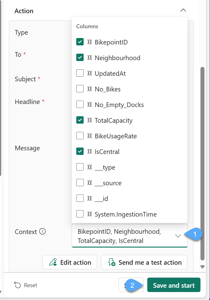 #9. The last property that you will configure is the Context, currently Activator's are limited to only allowing 5 distinct columns to be used in the action, choose BikepointId, Neighborhood, TotalCapacity and IsCentral and click Save and Start.