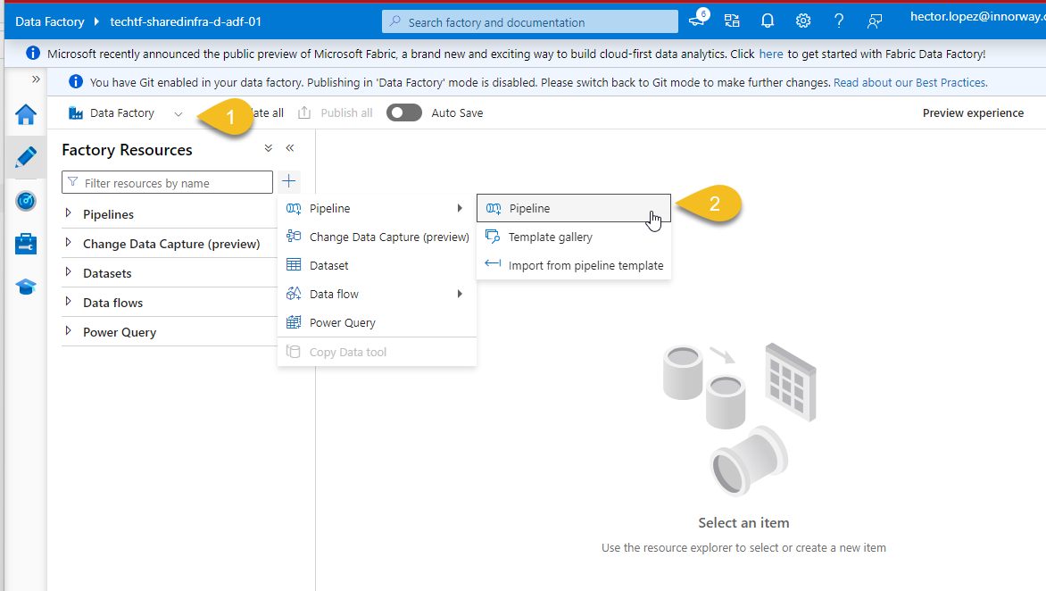 Assuming that you followed the series and Deployed Notebooks across environments with DevOps YAML Pipelines , I'll jump right to Azure Data Factory's Live Mode (1) and from Factory Resources, create a new pipeline (2)