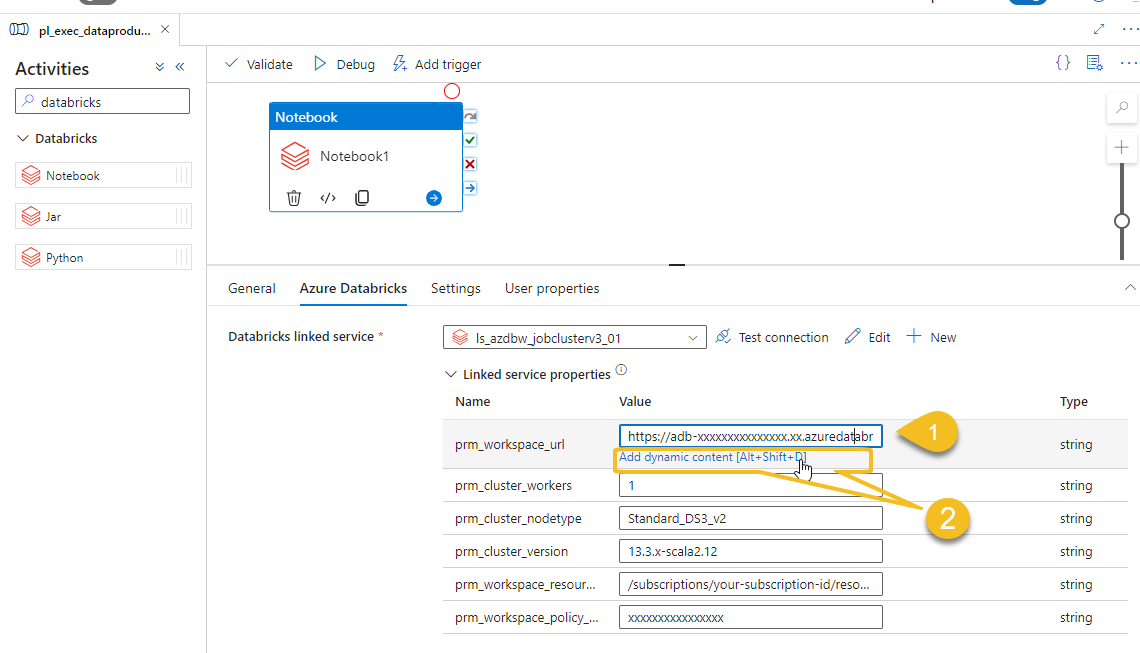 Place your self in linked service property prm_workspace_url (1) and click Ad dynamic content (2)