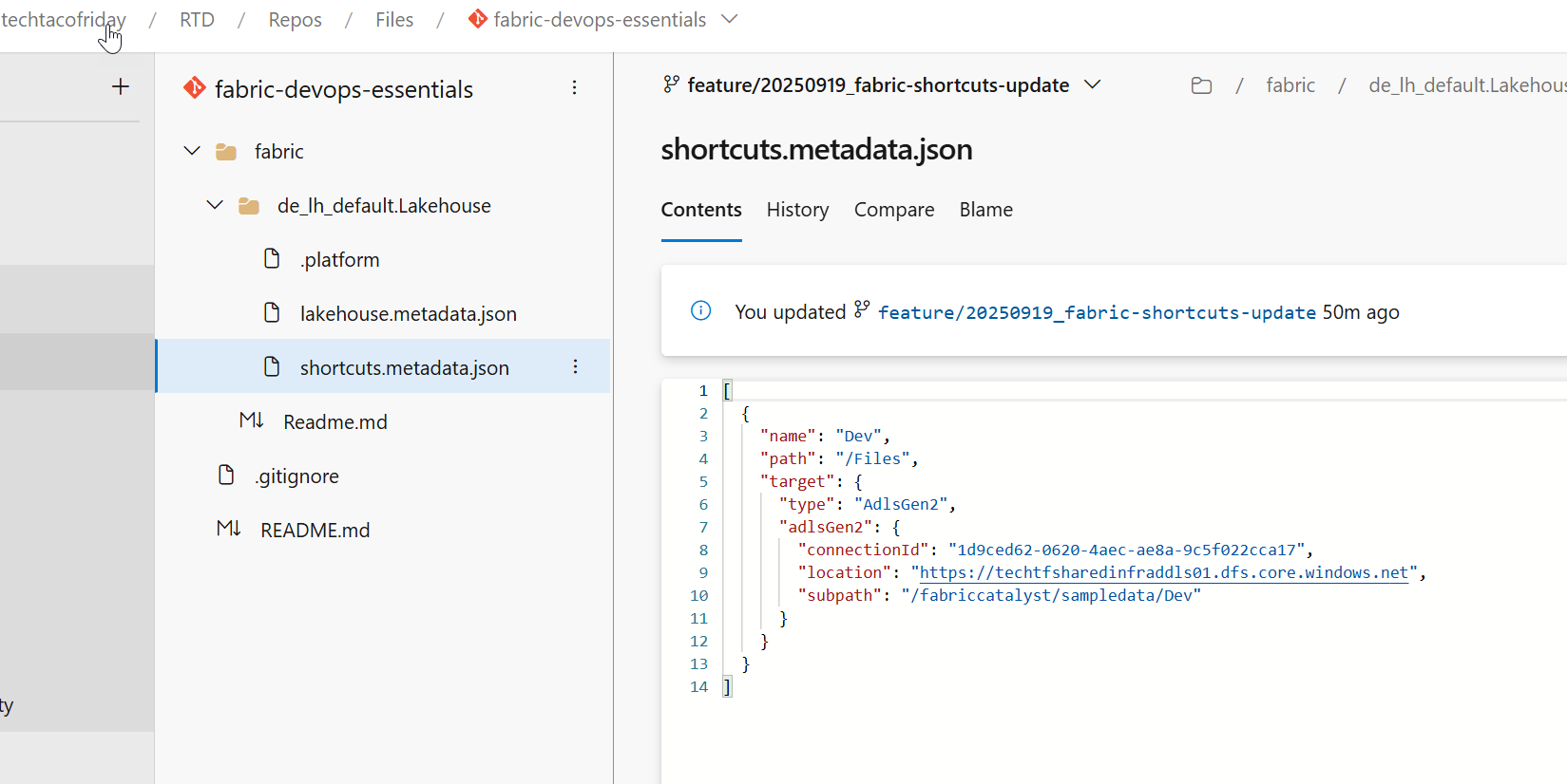 Let' see under the hood, this is the definition of the Lakehouse in code, notice how the shortcuts.metadata.json defines the shortcuts, hence, the pipeline will take dev's definition and override whatever other existing definition in integration (int)... that is not a flaw nor a bug, that what deployment pipelines are meant to do.