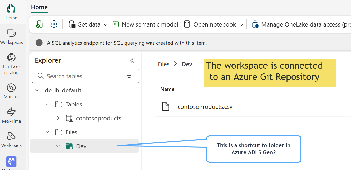 This is my "replica" of your environment, a workspace connected to Git Repository with a Shortcut to an Azure Data Lake Storage