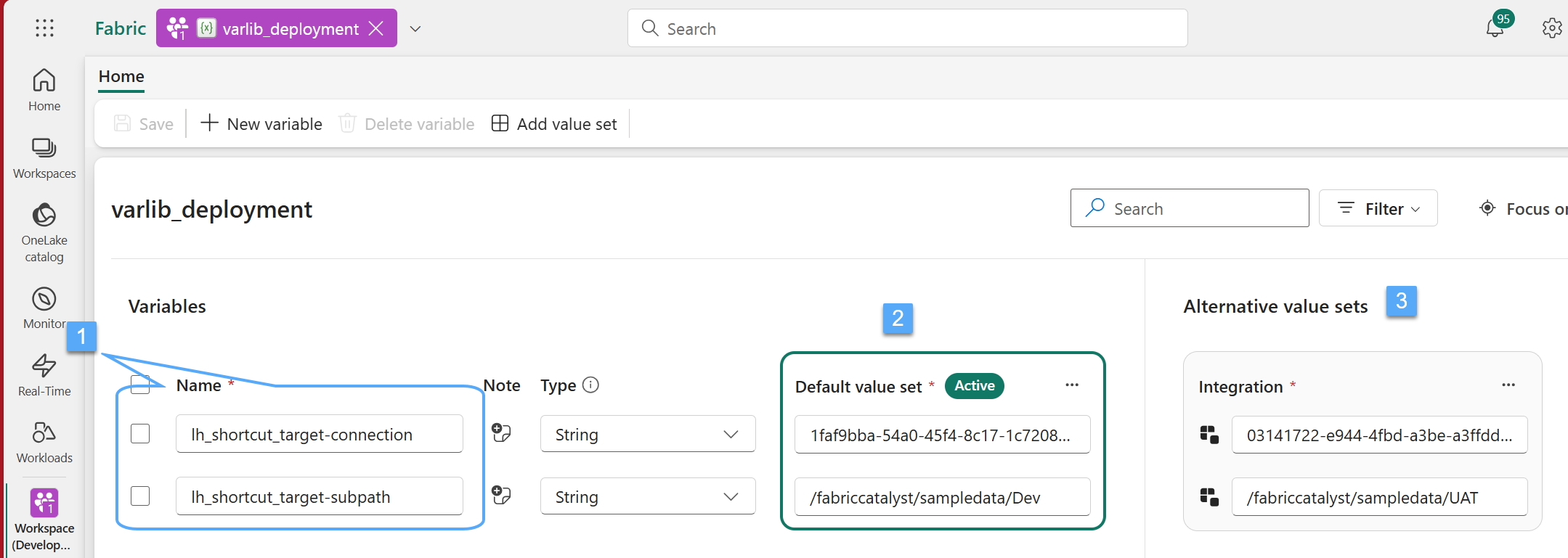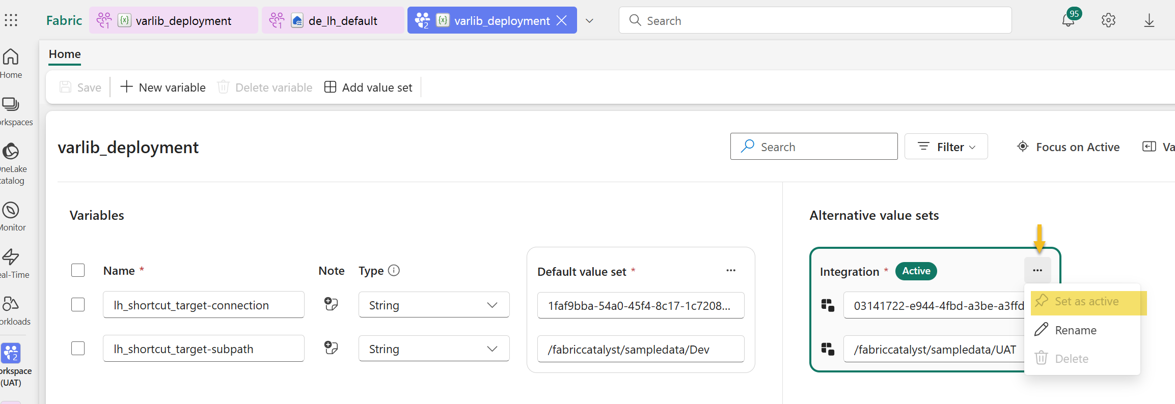 - Deploy the stages in your pipeline, this will replicate the variable library item with the default and alternative value sets
